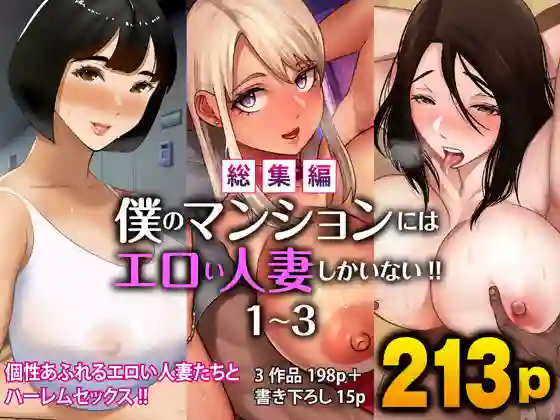 d_648039 【総集編】僕のマンションにはエロい人妻しかいない!!1〜3のエロ漫画| 僕のマンションにはエロい人妻しかいない!!1〜3の総集編です!本編(198p)+書き下ろし(15p) 総ページ数213p!!マンションに住むエロい人妻達が乱れる姿を是非お楽しみ下さい!●収録作品・僕のマンションにはエロい人妻しかいない!! 〜明るい欲求不満 美人受付嬢 野崎瞳〜(66P)・僕のマンションにはエロい人妻しかいない!!2〜…d_648039 【総集編】僕のマンションにはエロい人妻しかいない!!1〜3の無料エロ漫画作品紹介